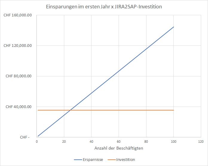 Bei einer Gesamtinvestition von CHF 35,600 (inklusive JIRA2SAP-Lizenz sowie Anpassung an unternehmensspezifische SAP-Module und Prozesse) wird der Break-even-Punkt innerhalb eines Jahres bei rund 25 betroffenen Nutzern erreicht.